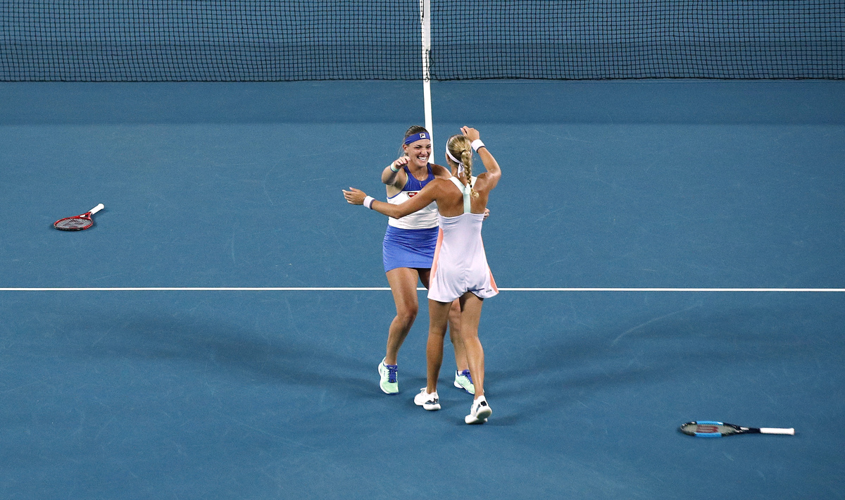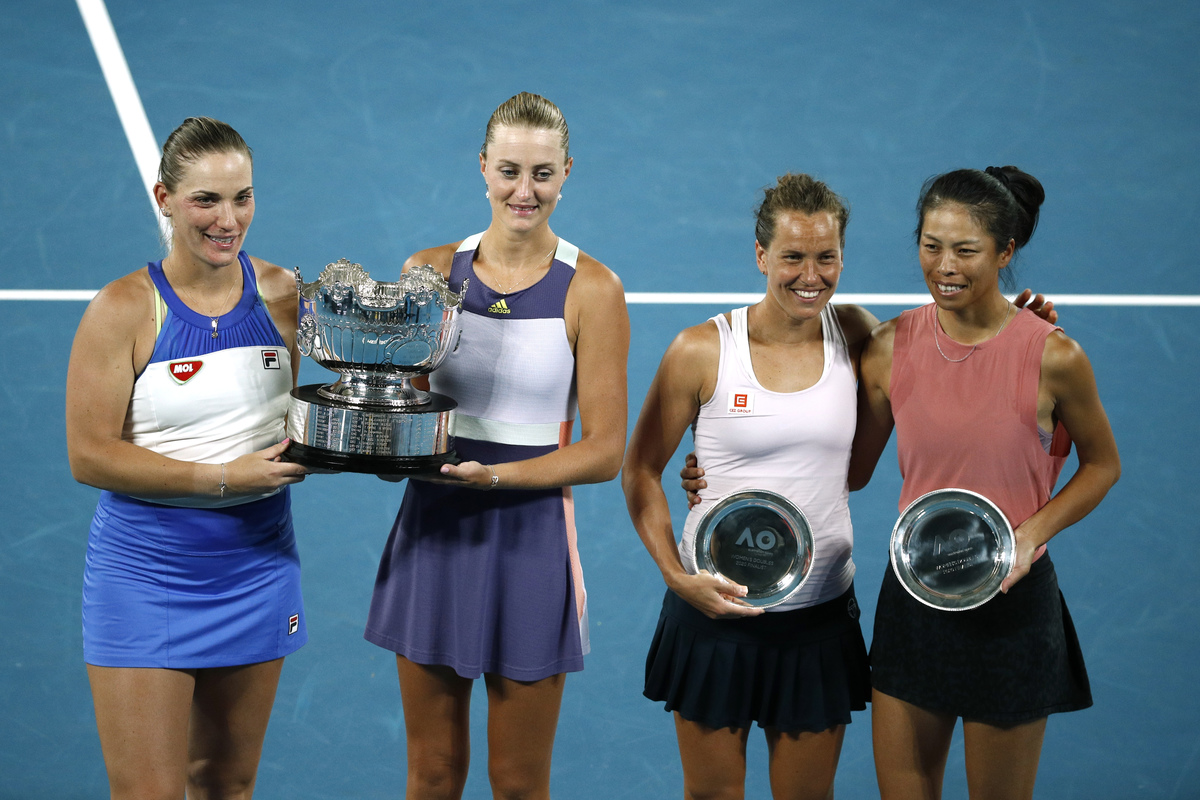 Tennis - Australian Open - Women's Doubles Final - Melbourne Park, Melbourne, Australia - January 31, 2020 Taiwan's Su-Wei Hsieh and Czech Republic's Barbora Strycova pose with their runners up trophies after losing in the final against Hungary's Timea Babos and France's Kristina Mladenovic. REUTERS/Kim Hong-JiTennis - Australian Open - Women's Doubles Final - Melbourne Park, Melbourne, Australia - January 31, 2020 Hungary's Timea Babos and France's Kristina Mladenovic celebrate with the trophy after winning the final against Taiwan's Su-Wei Hsieh and Czech Republic's Barbora Strycova. REUTERS/Edgar SuTennis - Australian Open - Women's Doubles Final - Melbourne Park, Melbourne, Australia - January 31, 2020 Hungary's Timea Babos and France's Kristina Mladenovic celebrate winning their match against Taiwan's Su-Wei Hsieh and Czech Republic's Barbora Strycova. REUTERS/Kim Hong-JiTennis - Australian Open - Women's Doubles Final - Melbourne Park, Melbourne, Australia - January 31, 2020 Taiwan's Su-Wei Hsieh and Czech Republic's Barbora Strycova react during their match against Hungary's Timea Babos and France's Kristina Mladenovic. REUTERS/Kim Hong-JiTennis - Australian Open - Women's Doubles Final - Melbourne Park, Melbourne, Australia - January 31, 2020 Hungary's Timea Babos and France's Kristina Mladenovic in action during their match against Taiwan's Su-Wei Hsieh and Czech Republic's Barbora Strycova. REUTERS/Kim Hong-JiTennis - Australian Open - Women's Doubles Final - Melbourne Park, Melbourne, Australia - January 31, 2020 Hungary's Timea Babos and France's Kristina Mladenovic celebrate winning their match against Taiwan's Su-Wei Hsieh and Czech Republic's Barbora Strycova. REUTERS/Edgar SuTennis - Australian Open - Women's Doubles Final - Melbourne Park, Melbourne, Australia - January 31, 2020 Hungary's Timea Babos and France's Kristina Mladenovic celebrate winning their match against Taiwan's Su-Wei Hsieh and Czech Republic's Barbora Strycova. REUTERS/Edgar Su