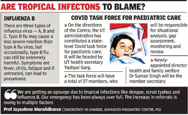 “We are getting an upsurge due to tropical infections like dengue, scrub typhus and influenza B. Our emergency has been always over full. The increase in referrals is owing to multiple factors. One of the reasons is delay in seeking health care. Lack of resources at primary and secondary health care facilities results in loss of the golden hour,” said Prof Jayashree Muralidharan, emergency in-charge, Advanced Paediatric Centre, PGI.