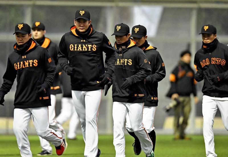 Yomiuri Giants players, including Tomoyuki Sugano, third from left, and Hayato Sakamoto, right, jog on the first day of spring training camp in Miyazaki on Thursday. Before practicing, the Giants held a ceremony to commemorate their 60th year of training in Miyazaki. The Giants, under third-year manager Yoshinobu Takahashi, were one of 11 teams that opened camp in either Miyazaki or Okinawa prefectures. The Hokkaido Nippon Ham Fighters will open their camp in Arizona.