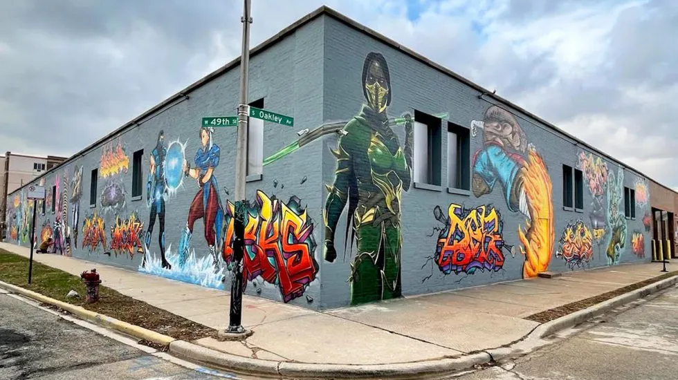 The mural at 49th Street and Oakley Avenue — which can be seen from the CTA Orange Line’s Western Avenue L stop — pits characters from classic fighting games Street Fighter and Mortal Kombat against each other.