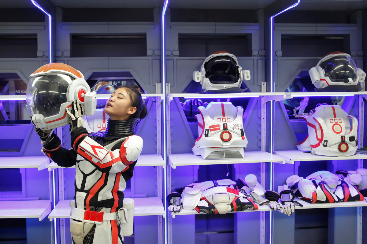 A staff member demonstrates how she puts on the helmet of a mock space suit at the C-Space Project Mars simulation base in the Gobi Desert outside Jinchang, Gansu Province, China, April 17, 2019. REUTERS/Thomas Peter