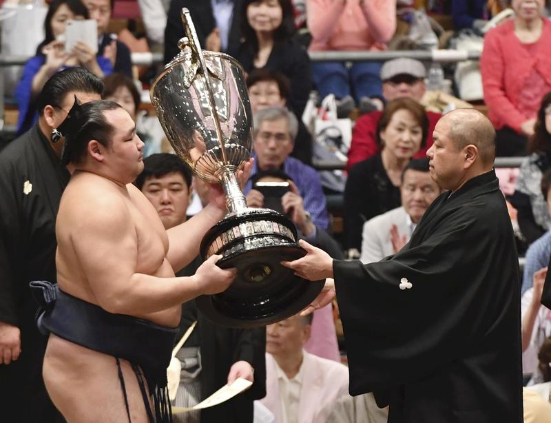 Yokozuna Kakuryu receives the Emperor's Cup from Japan Sumo Association Chairman Hakkaku at the Edion Arena Osaka on Sunday. The Mongolian yokozuna clinched his fourth career title at the Spring Grand Sumo Tournament the previous day, finishing the basho 13-2 for his first championship in eight tourneys.