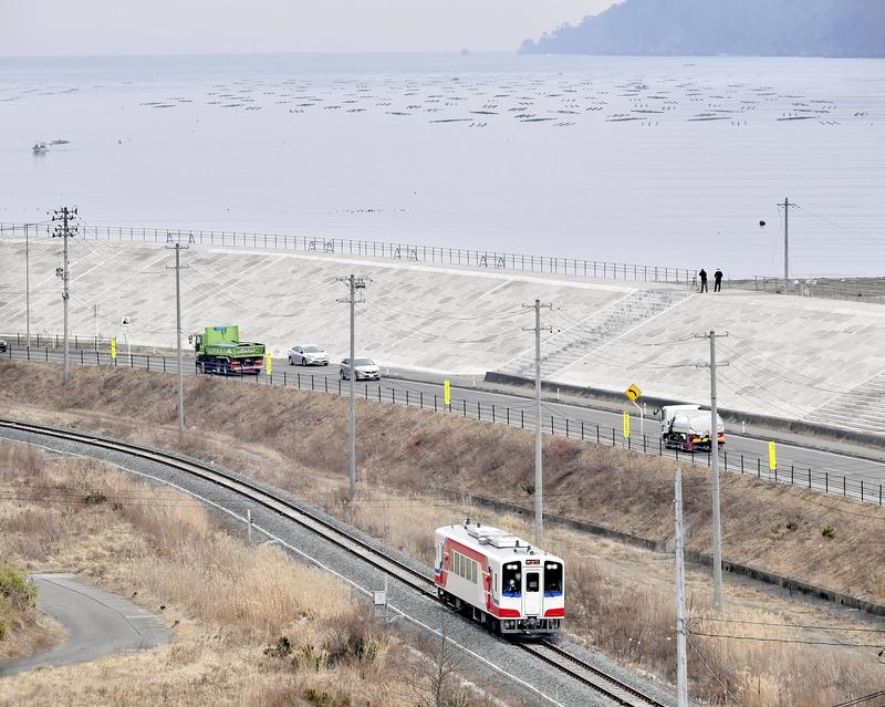 A train car runs near a coastal levee in Miyako, Iwate Prefecture, on Monday morning during a test run of the JR Yamada Line. The line has been suspended between Miyako and Kamaishi in the prefecture since the Great East Japan Earthquake in 2011.