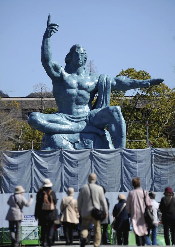 People look at the Peace Statue, which was repainted to restore its original blue color, in the Peace Park in Nagasaki on Wednesday. The 9.7-meter-high bronze statue was created by sculptor Seibo Kitamura in August 1955 and last repainted about 20 years ago. Renovation work is expected to be completed at the end of this month.
