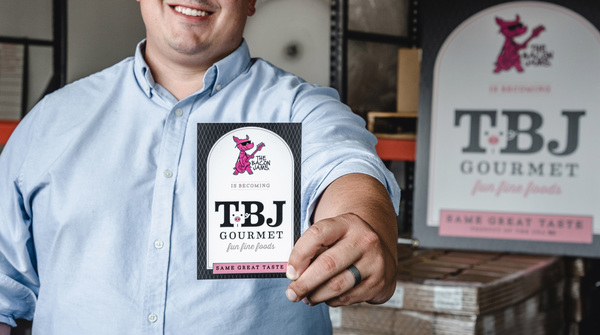 A new subdued look is on the menu for a fourth-quarter debut: TBJ Gourmet, thick black letters say. Discreetly tucked in the white space between the "T" and "B" are the tiny face, front legs and curly tail of a pig, its snout a soft pink.