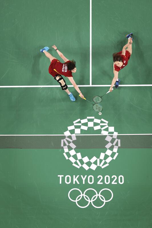 As the white shuttlecock smoothly descended by the net in a badminton doubles match, the Japanese pair of Sayaka Hirota and Yuki Fukushima quickly stretched toward it with their rackets -- a moment captured in a dramatic overhead photo that shows their bodies and equipment forming a V.
