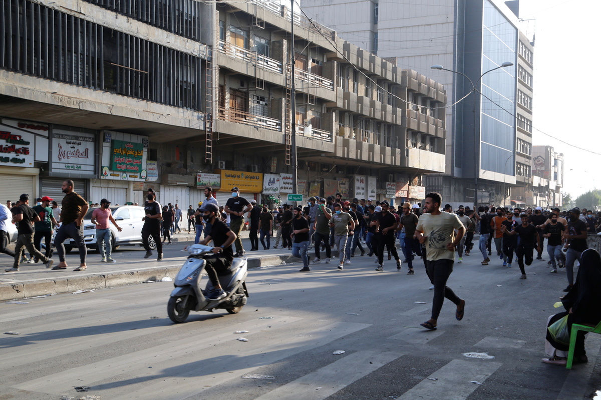 Police fired tear gas and live ammunition into the air as scores of the protesters threw stones and tried to advance towards Baghdad's fortified Green Zone, which houses government buildings and foreign embassies, the security sources said.