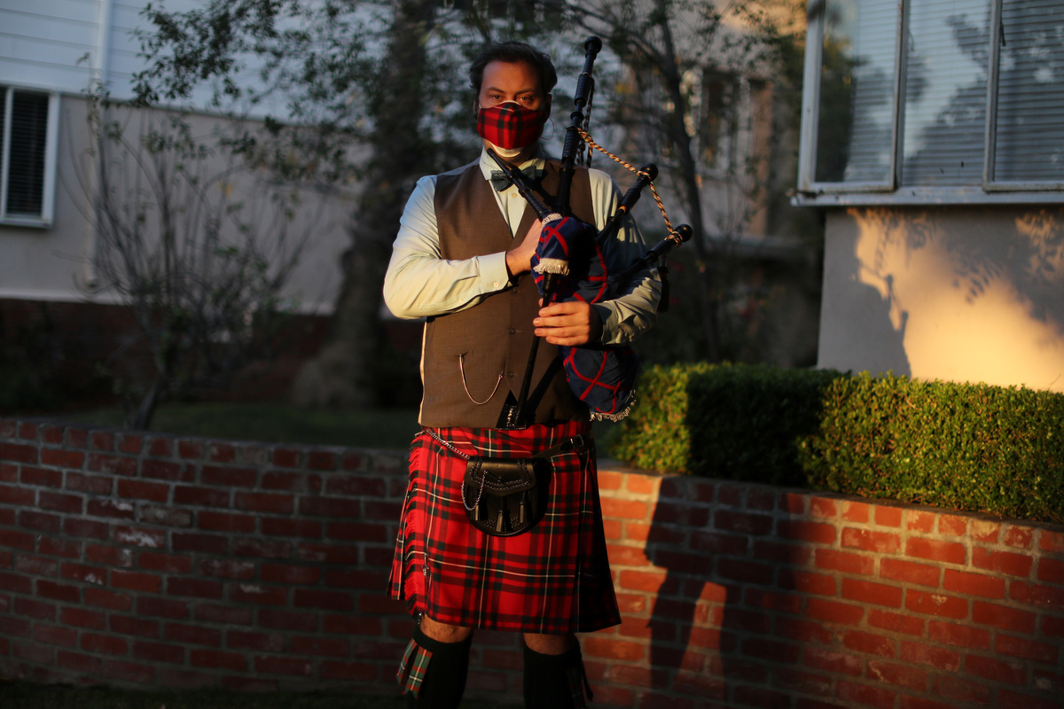 Andrew McGregor, dressed in a kilt and sporran, with a tartan face mask when he is not playing, says he wants to honor the victims of the coronavirus with his rendition of the traditional hymn.