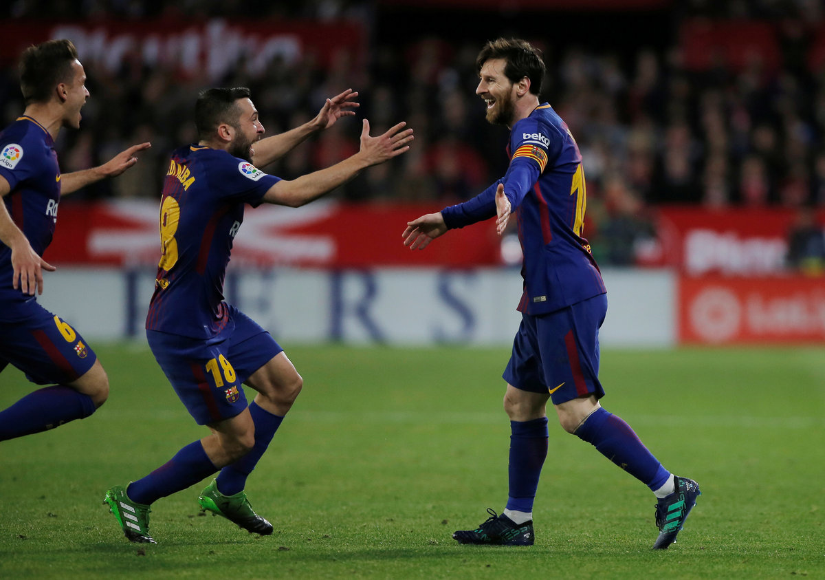 Soccer Football - La Liga Santander - Sevilla vs Barcelona - Ramon Sanchez Pizjuan, Seville, Spain - March 31, 2018 Barcelona's Lionel Messi celebrates scoring their second goal with Jordi Alba REUTERS/Jon Nazca