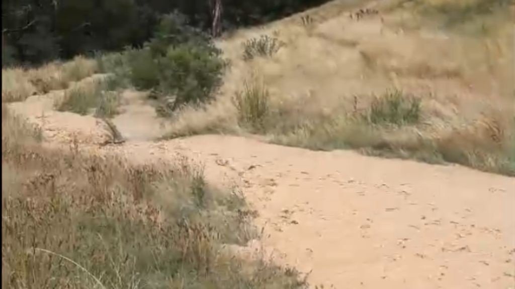 On rainy days, a heavy flow of thick, orange sludge runs rapidly down a cleared Ballarat development site into the river below.