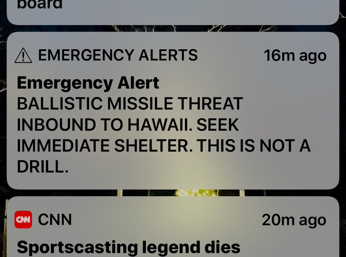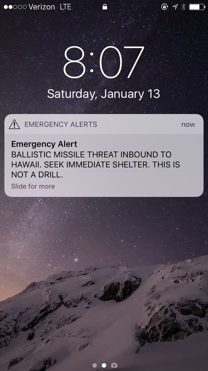 The mistaken alert stated: "EMERGENCY ALERT BALLISTIC MISSILE THREAT INBOUND TO HAWAII. SEEK IMMEDIATE SHELTER. THIS IS NOT A DRILL." The alert, sent to mobile phones and aired on television and radio shortly after 8 a.m., was issued amid high international tensions over North Korea's development of ballistic nuclear weapons.