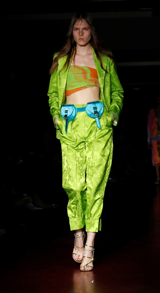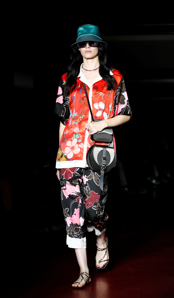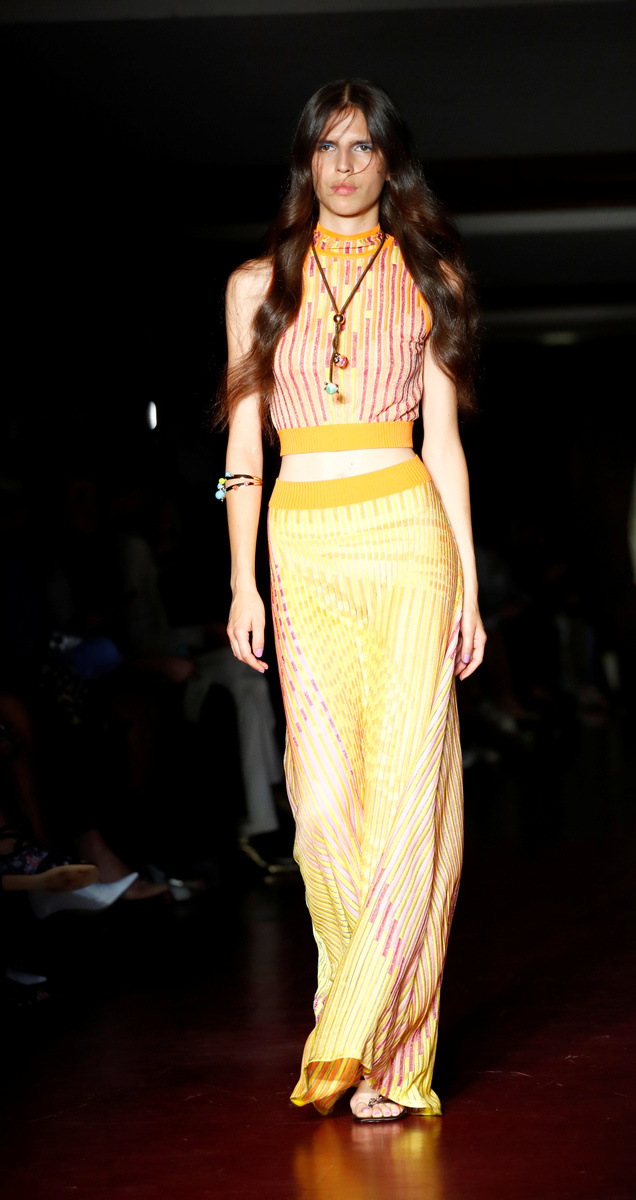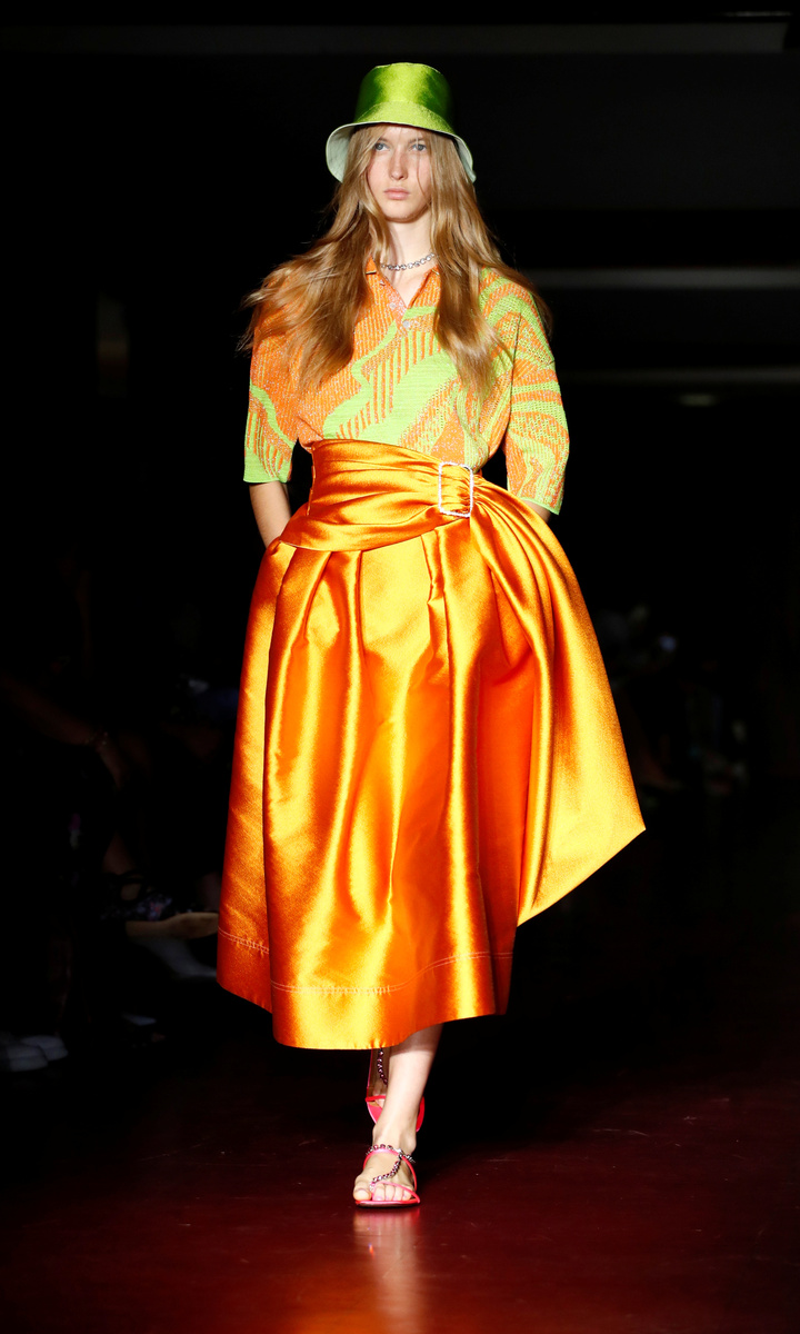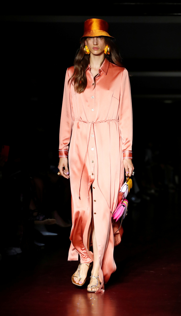 Italian designer Alberta Ferretti picked vibrant colours for her collection that also nodded to 1970s fashion: long dresses, tunic tops and frilled shirts tucked into high-waisted trousers or shorts.