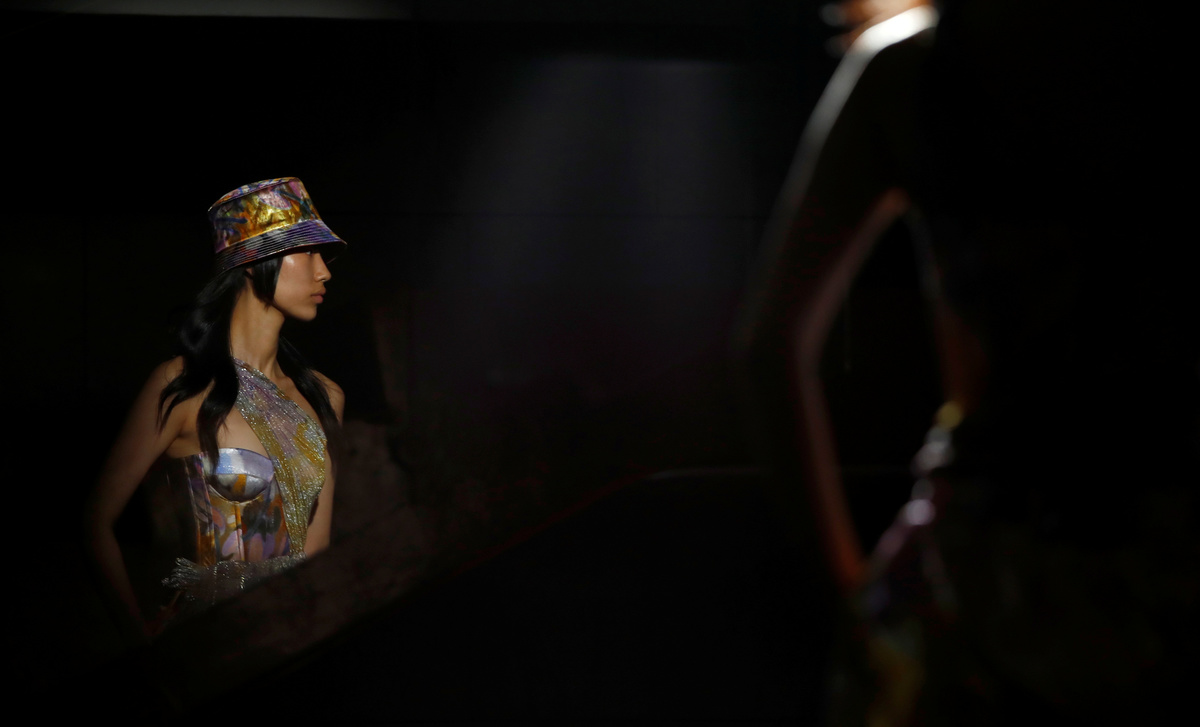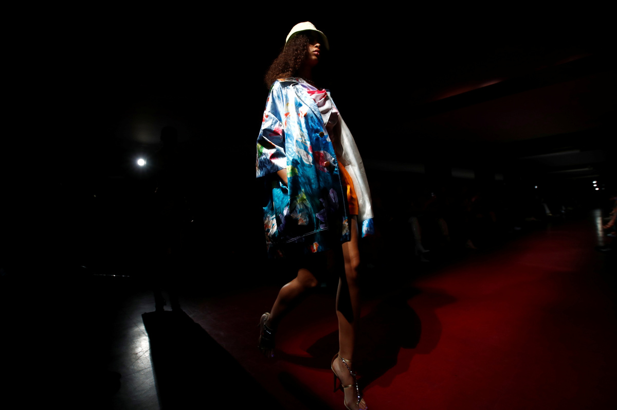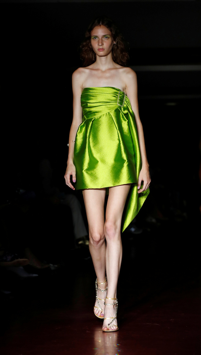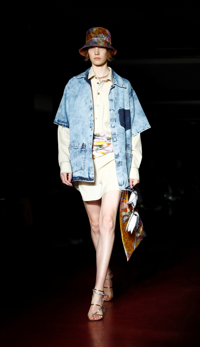 Italian designer Alberta Ferretti picked vibrant colours for her collection that also nodded to 1970s fashion: long dresses, tunic tops and frilled shirts tucked into high-waisted trousers or shorts.