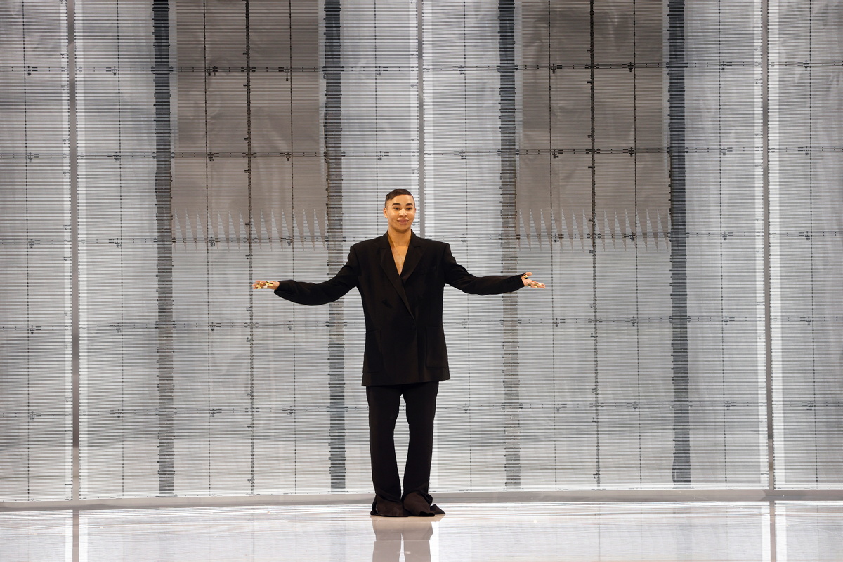 For his anniversary show, the designer sent models down the catwalk in long trousers that covered the ankles and clingy dresses made of strips of fabric that wound around the body and crisscrossed the chest like bandages, some left dangling.