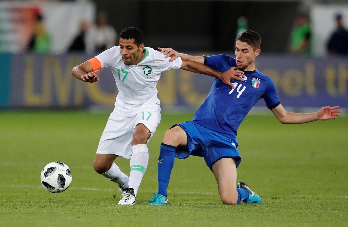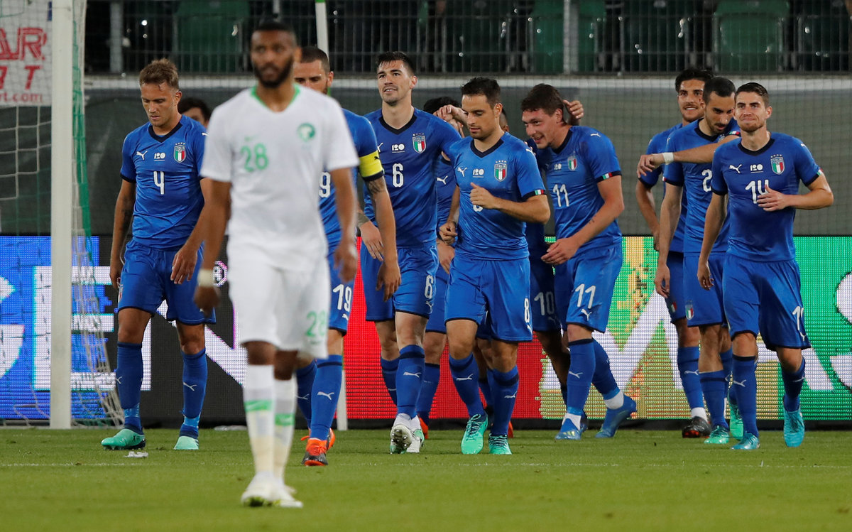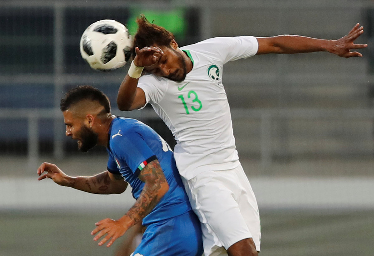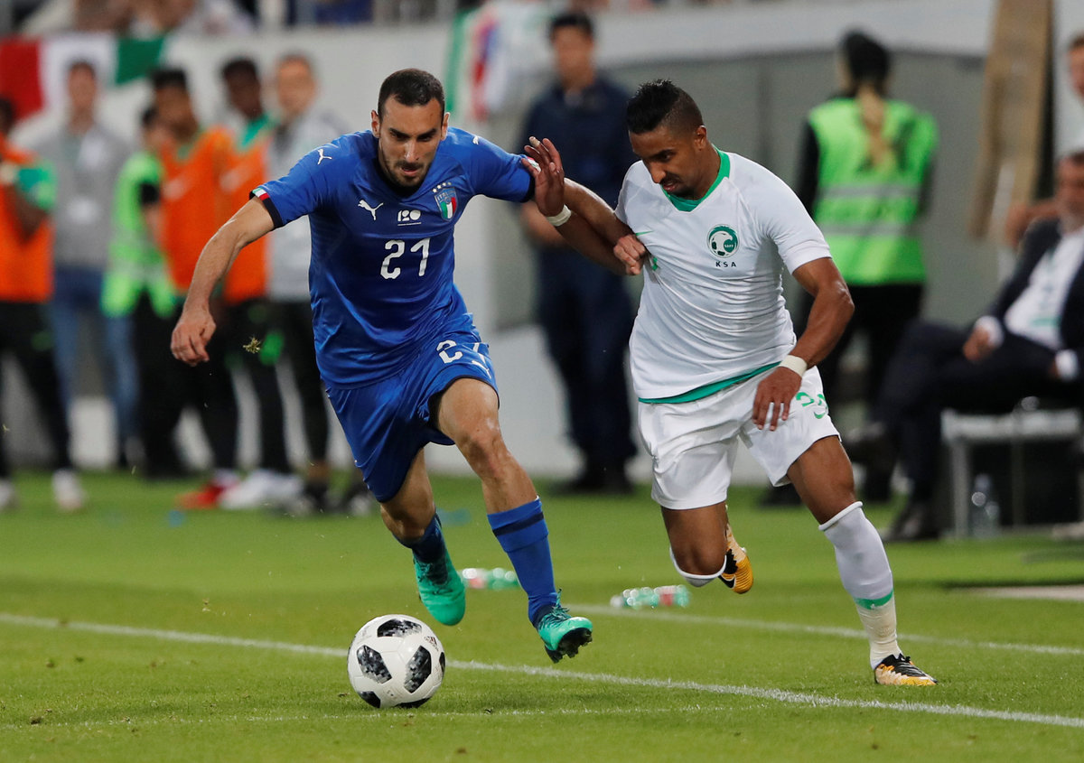 Soccer Football - International Friendly - Italy vs Saudi Arabia - Kybunpark, St. Gallen, Switzerland - May 28, 2018 Italy's Lorenzo Insigne in action with Saudi Arabia's Yasser Al-Shahrani REUTERS/Arnd WiegmannSoccer Football - International Friendly - Italy vs Saudi Arabia - Kybunpark, St. Gallen, Switzerland - May 28, 2018 Saudi Arabia's Mohammed Kanno in action REUTERS/Arnd WiegmannSoccer Football - International Friendly - Italy vs Saudi Arabia - Kybunpark, St. Gallen, Switzerland - May 28, 2018 Italy's Jorginho in action with Saudi Arabia's Taiseer Al Jassam REUTERS/Arnd WiegmannSoccer Football - International Friendly - Italy vs Saudi Arabia - Kybunpark, St. Gallen, Switzerland - May 28, 2018 Saudi Arabia's Salem Al-Dawsari in action with Italy's Davide Zappacosta REUTERS/Arnd WiegmannSoccer Football - International Friendly - Italy vs Saudi Arabia - Kybunpark, St. Gallen, Switzerland - May 28, 2018 Italy's Andrea Belotti celebrates scoring their second goal with team mates REUTERS/Arnd WiegmannSoccer Football - International Friendly - Italy vs Saudi Arabia - Kybunpark, St. Gallen, Switzerland - May 28, 2018 Saudi Arabia's Yasser Al-Shahrani in action with Italy's Lorenzo Insigne REUTERS/Arnd Wiegmann