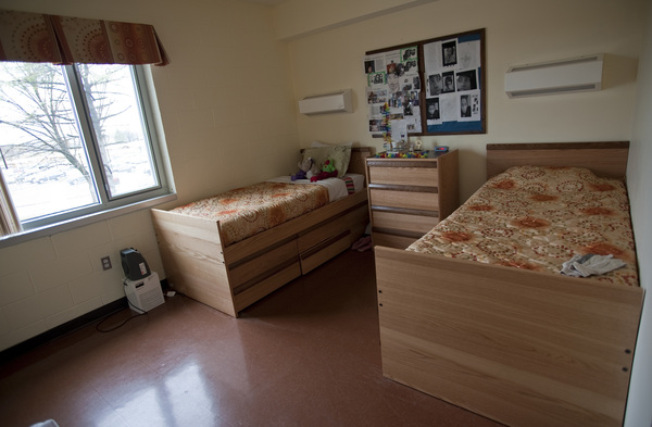 Conjure an image of where undergraduates live: a dry-erase board at the door, opening onto a tight space with lofted beds, desk chairs engineered against tipping over backwards, fluorescent lighting overhead and bad poster art on the walls.