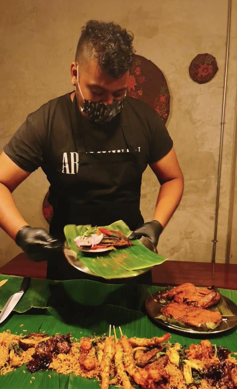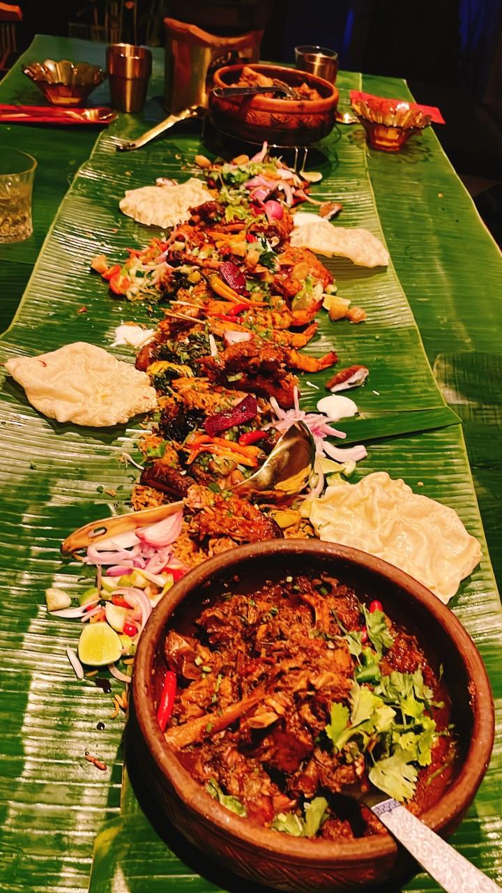 What constitutes "dinner and a show", the feast begins with chef Bank emptying biryani rice, which is cooked with confit garlic oil and pork lard, along the length of the table. What follows is a theatrical production of Aromkwan's finest, as the chef keeps bringing dishes and emptying them onto the banana leaf. BBQ bok choy comes next with smoked, barbecued cabbage, braised in shoyu, dried chilli, ginger and curry leaf. A quail egg smoked sambal gets added to the mix. Smoked cuttlefish is sautéed at the table with the South Asian mirepoix of onion, ginger and garlic forming the base of the dish. The cast iron pan is deglazed with Sangsom before adding a smoked seafood rasam. A dash of yoghurt, sawtooth parsley and coriander finish the dish.