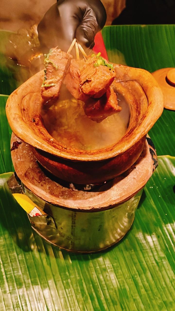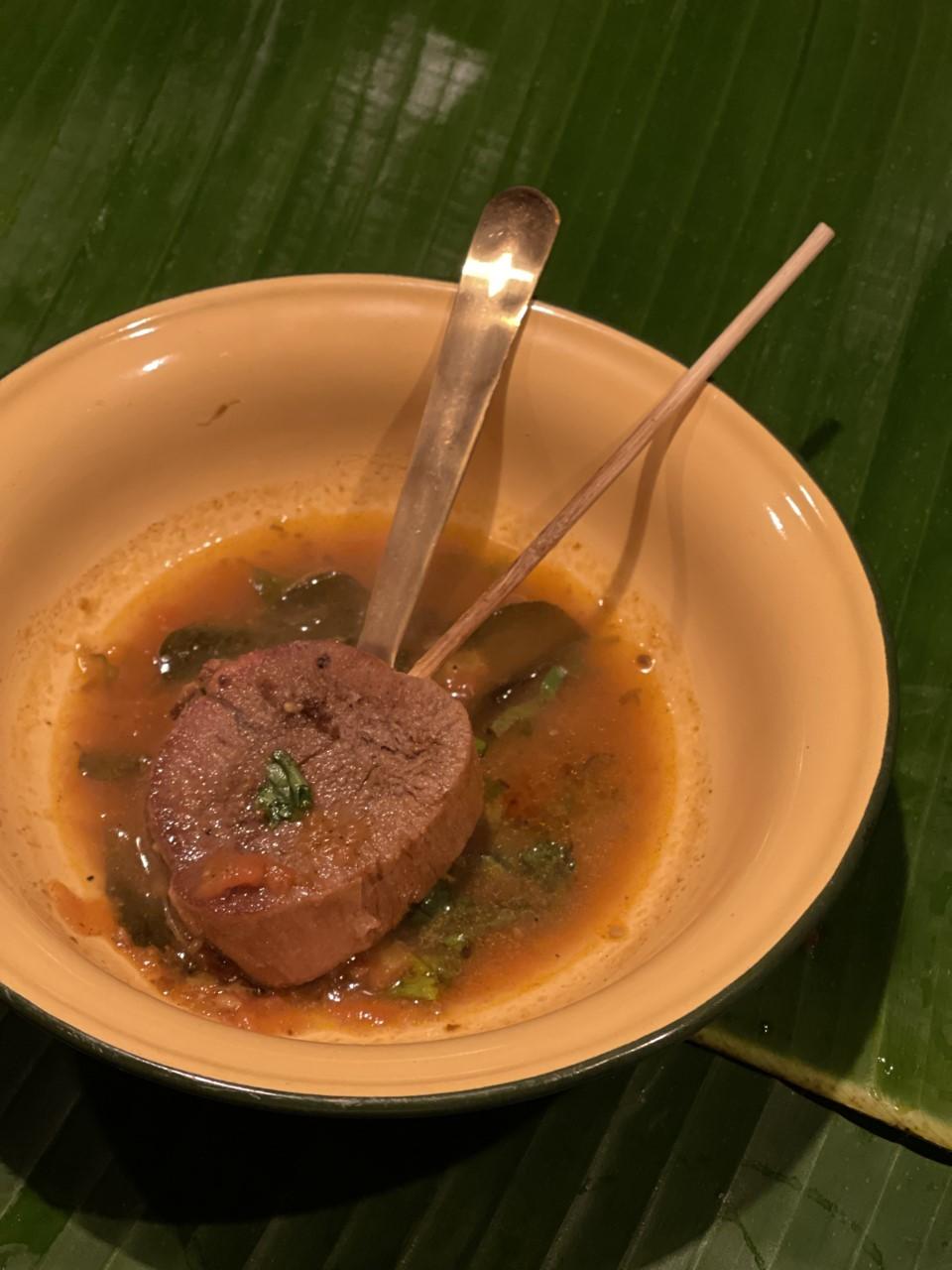 "The Tribute" pays homage to Aromkwan's food truck days. Six-hour smoked Char siu pig's cheek is barbecued at the table on banana leaves alongside Sticky wagyu picanha. The aroma that wafts through the air will make all your senses salivate. These two bites will get you going and long for more. Though what follows: "To The Soul" or the ox tongue rasam is the best tasting and heartiest rasam I've ever had! "I like to cook ox tongue, so I smoke it for nine hours and serve it with the rasam," says chef Bank. Rasam is a South Indian broth that is eaten before or after a meal to get your taste buds going and aid digestion. Once that is done, may the "Feast" begin!