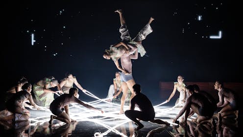 The stage is covered in stars that fill the depth of the space. When the 18 dancers slowly gather, they move through a night sky.