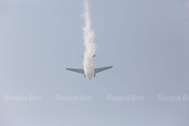 The Royal Thai Air Force on Saturday deployed two BT-67 planes from Wing 46 in Phitsanulok to spray water in the Chatuchak and Suk Sawat areas in the hope of clearing away some dust particles.