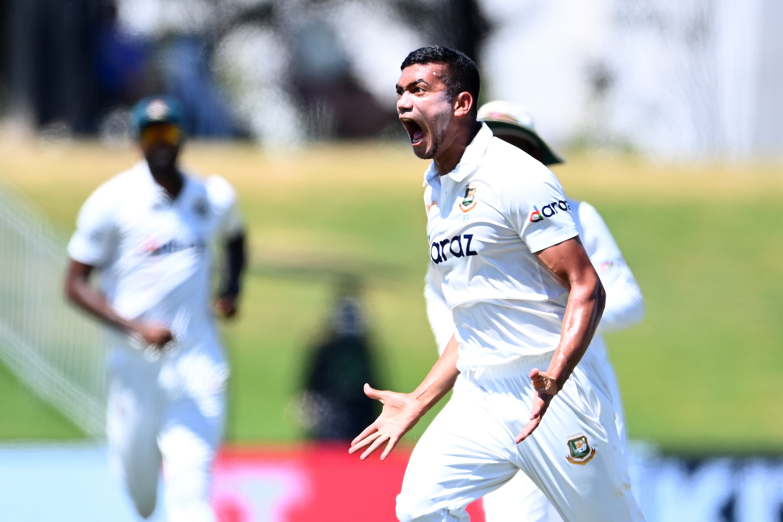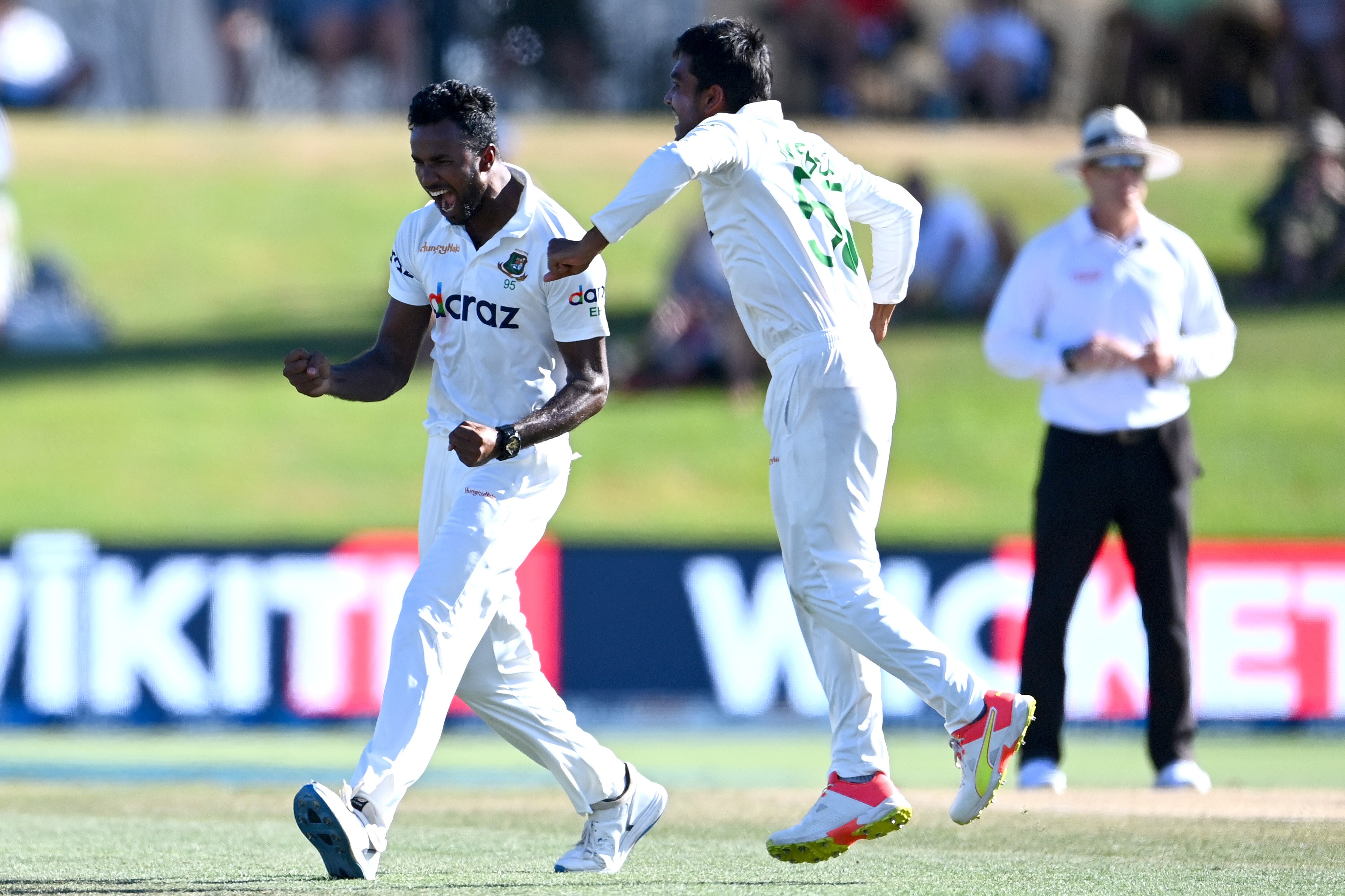 The tall right-armer, who snaps to attention and salutes when he takes a wicket, saluted twice when he bowled Taylor for 40. Then he dismissed Kyle Jamieson to leave New Zealand 160-7. Shoriful Islam pulled off a brilliant diving catch at mid-wicket to complete the second dismissal.