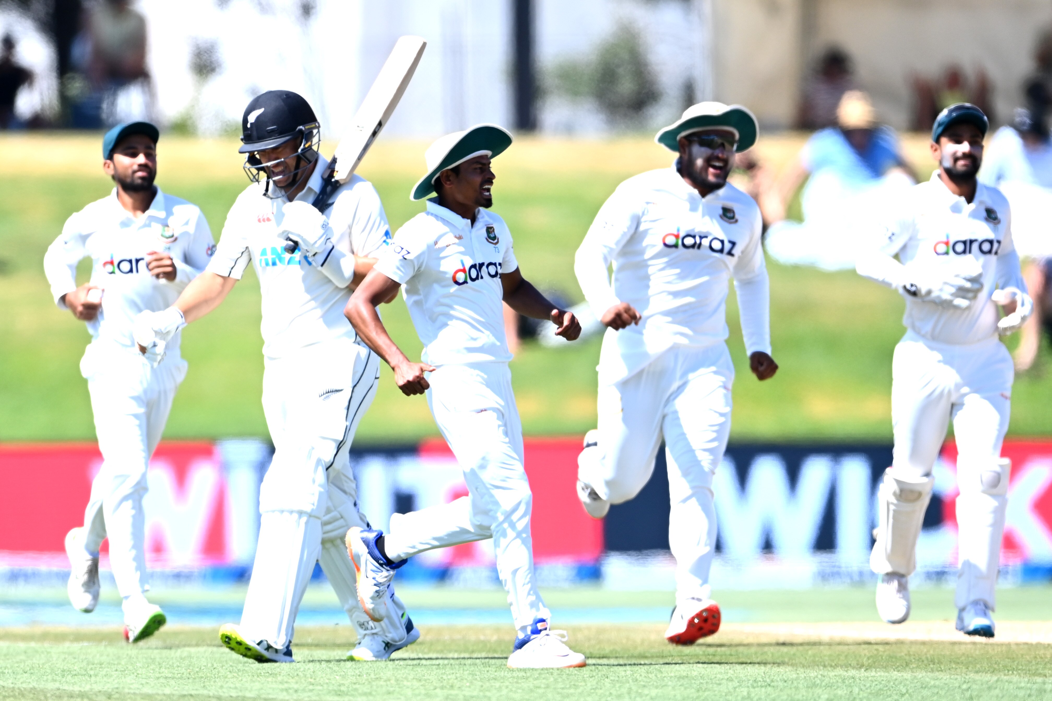 Taskin bowled Tim Southee (0) and Mehidy Hasan Miraz finished it off with the wicket of Trent Boult, who was brilliantly caught at deep mid-wicket by the substitute Taijul Islam.