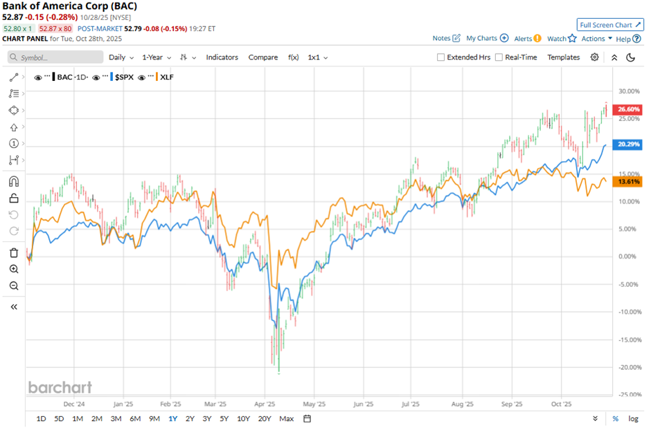 The Charlotte, North Carolina-based company's shares have outperformed the broader market over the past 52 weeks. BAC stock has increased 24.1% over this time frame, while the broader S&P 500 Index ($SPX) has rallied 18.3%. Moreover, shares of Bank of America are up 20.3% on a YTD basis, compared to SPX’s 17.2% return.