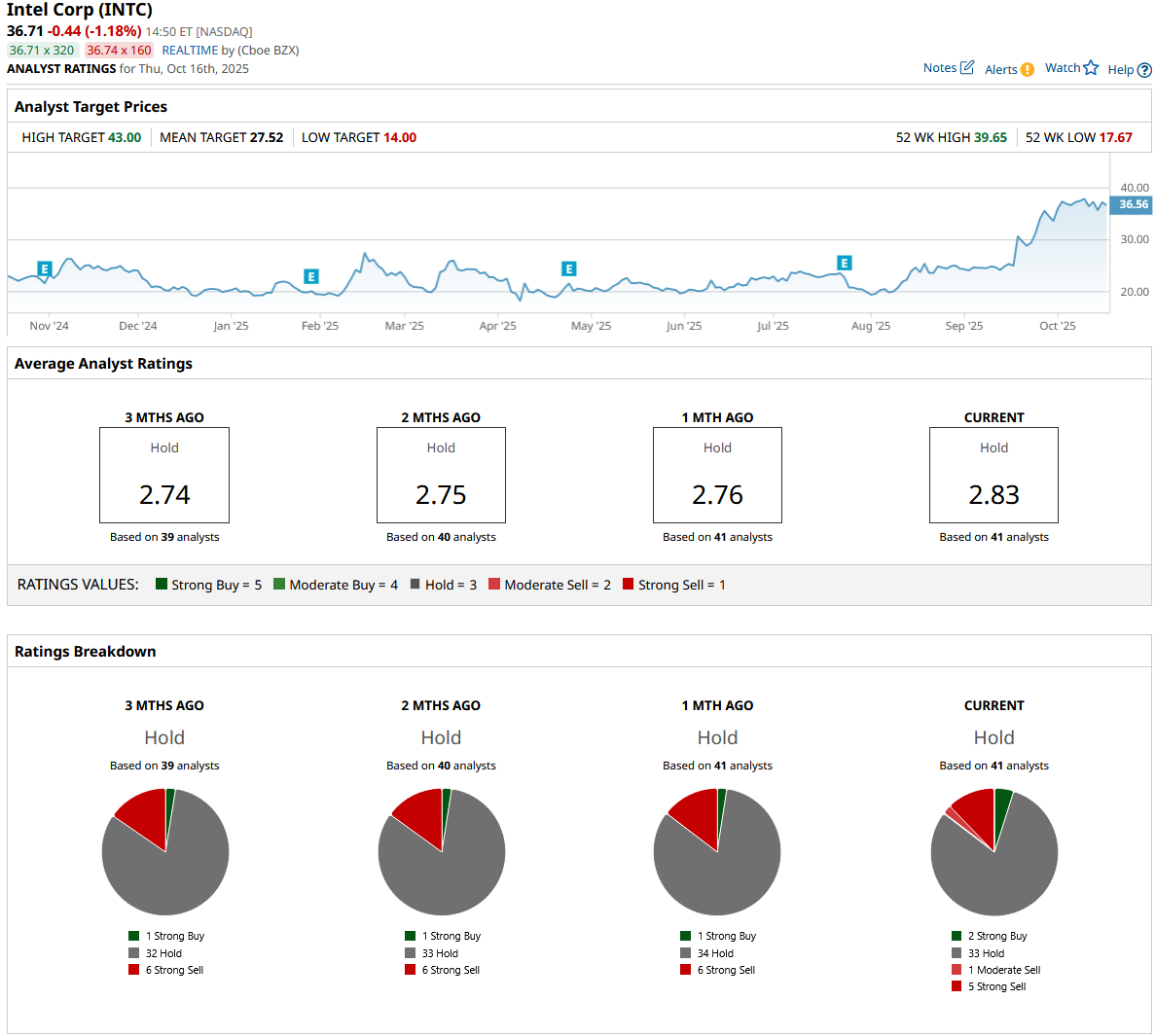 Out of the 41 analysts covering INTC stock, two recommend “Strong Buy,” 33 recommend “Hold,” one recommends “Moderate Sell,” and five recommend “Strong Sell.” The average INTC stock price target is $27.52, below the current price of $37.