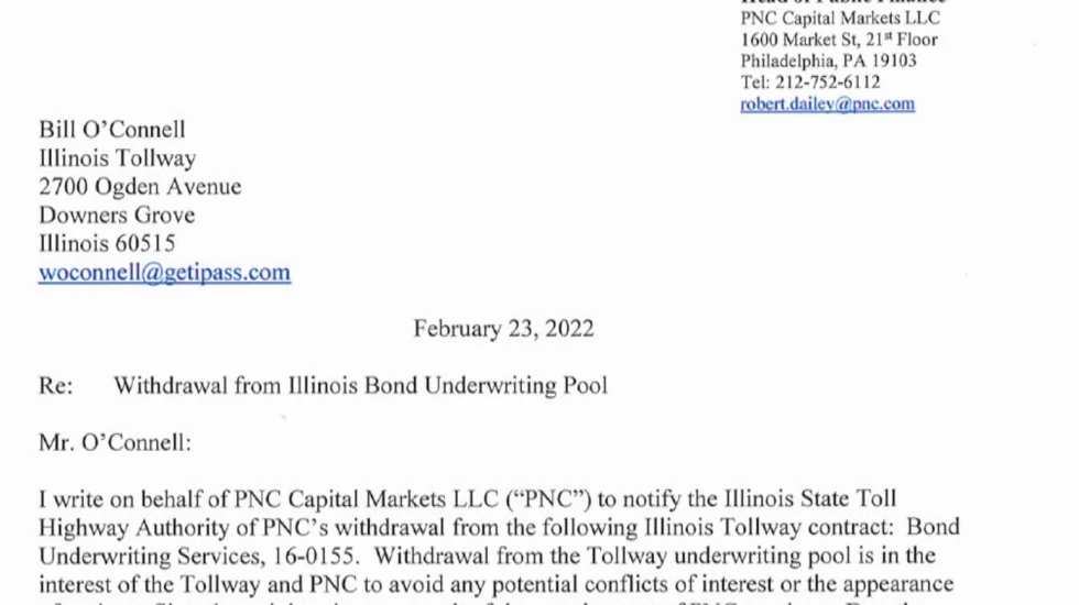 “I write on behalf of PNC Capital Markets LLC to notify the Illinois State Toll Highway Authority of PNC’s withdrawal from the following Illinois Tollway contract: Bond Underwriting Services,” wrote Dailey, managing director and head of public finance for PNC Capital Markets in Philadelphia.