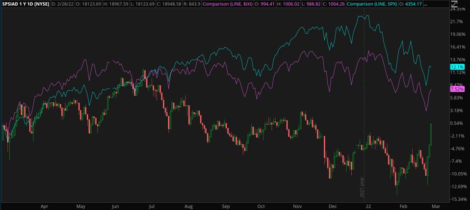 As one might expect, the aerospace and defense stocks were among the biggest gainers on the day. The S&P Aerospace & Defense Select Sector Industry Index rallied 4.55% on the news that the White House asked Congress for $6.4 billion to help Ukraine. BAE Systems (BAESY), Northrop Grumman