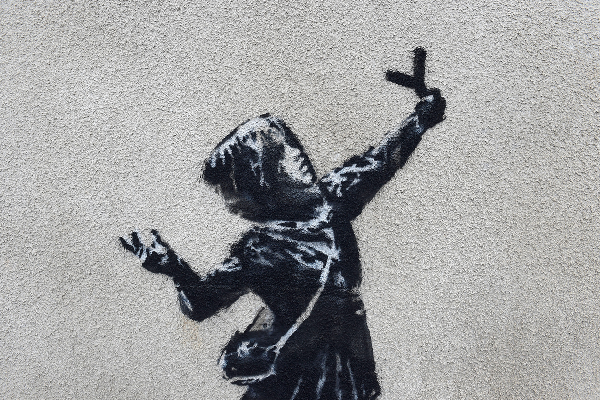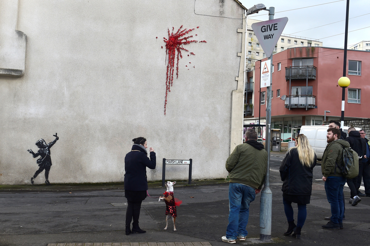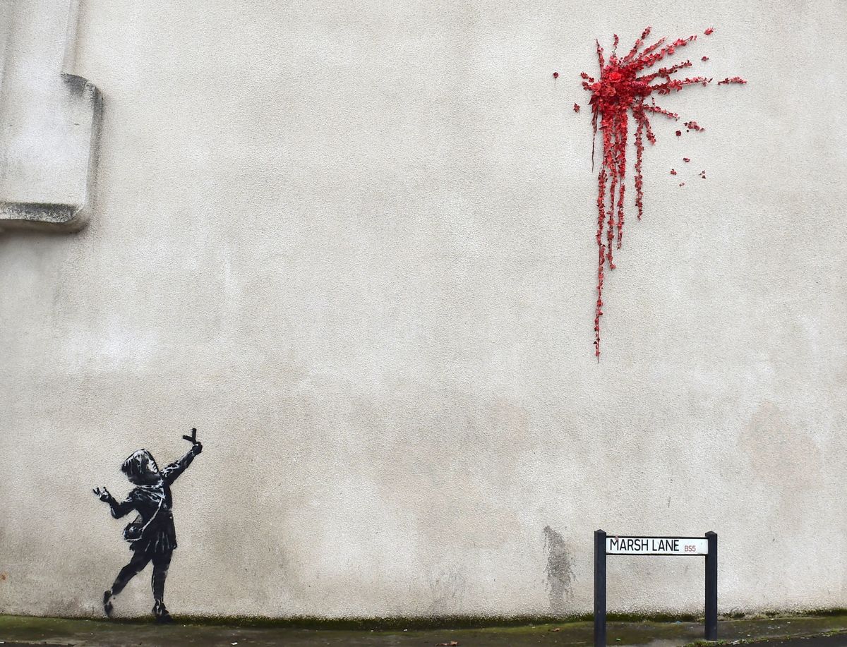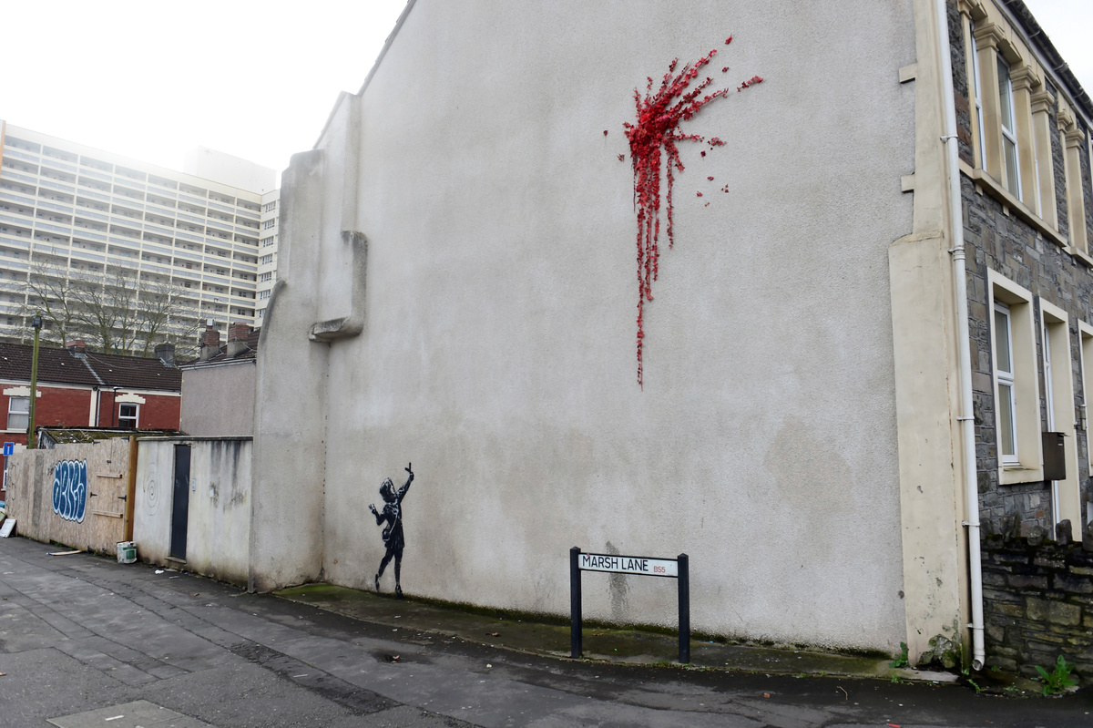 British street artist Banksy is thought to have given a Valentine's Day gift to his home town of Bristol in western England with the appearance of a new mural showing a small girl with a catapult and a splatter of red flowers.