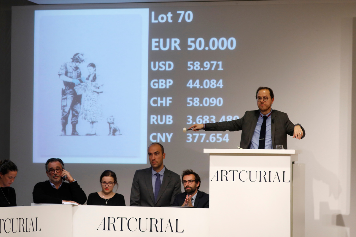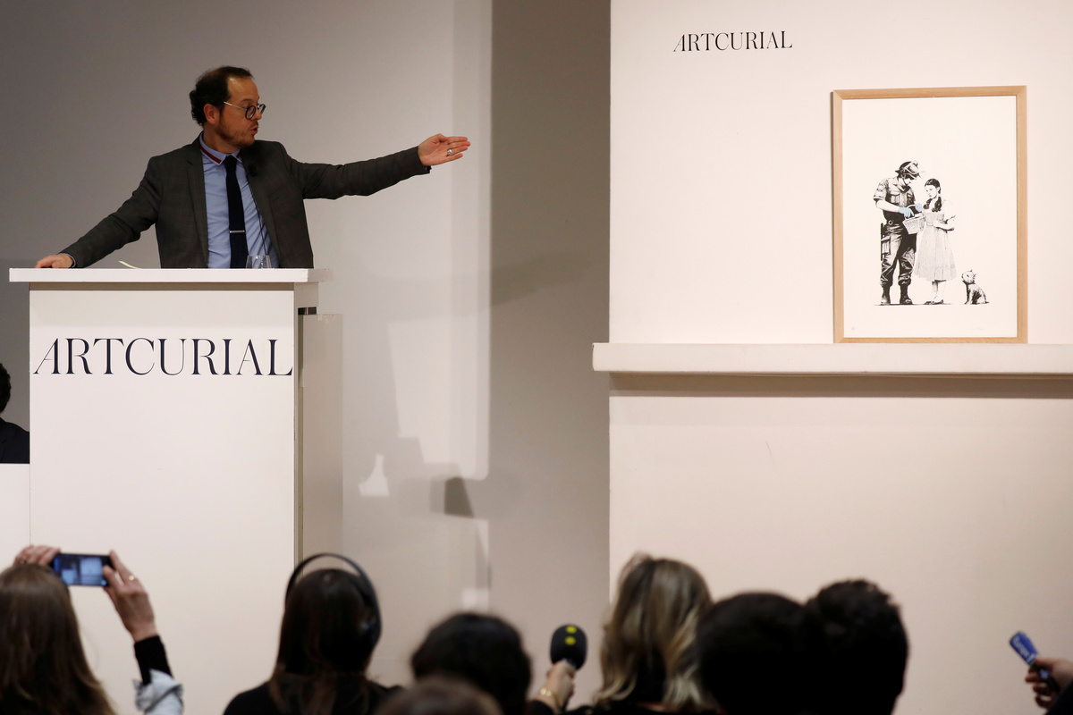 Auctioneer Arnaud Oliveux points at the offset lithograph entitled "Stop and Search" (2007) by British street artist Banksy at the urban art auction organized by Artcurial in Paris, France, October 24, 2018. REUTERS/Charles Platiau