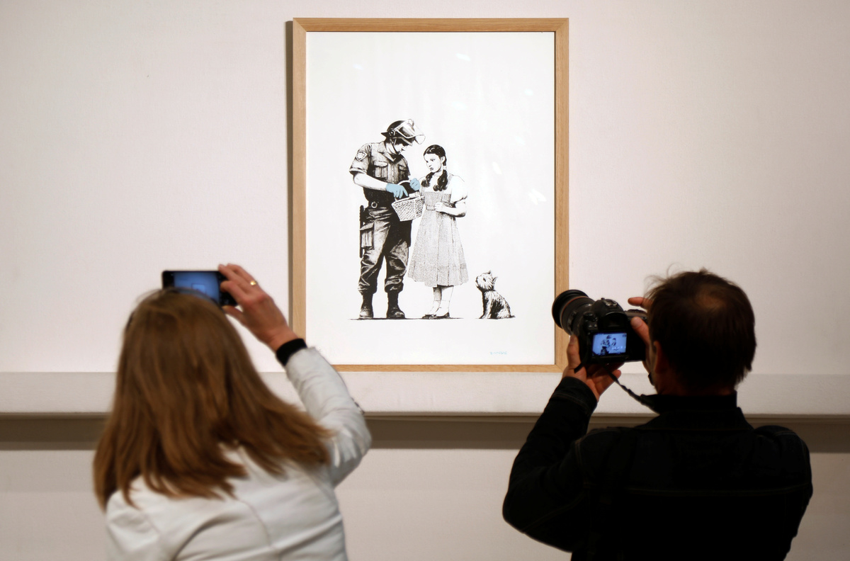 A print of "Stop and Search", depicting Dorothy from "The Wizard of Oz" as well as two other pieces signed by Banksy, "Queen Vic" and "Soup can Yellow/ Emerald/ Brown", sold for more than more than 120,000 euros ($137,000) in total.