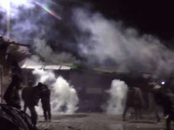 The video was taken by Calais Migrant Solidarity and shows refugees trying to kick gas cannisters away fand avoid water cannon.