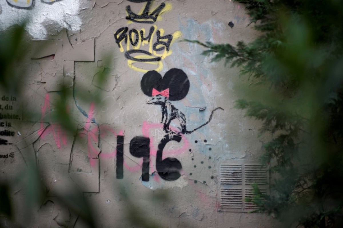 Referencing the anniversary, Banksy painted a picture of a rat holding a stencil pen and wearing a bandana over its face on the side of a building near the Pompidou Center. Another showed a rat dressed as Mini Mouse perched on the numbers 1968.