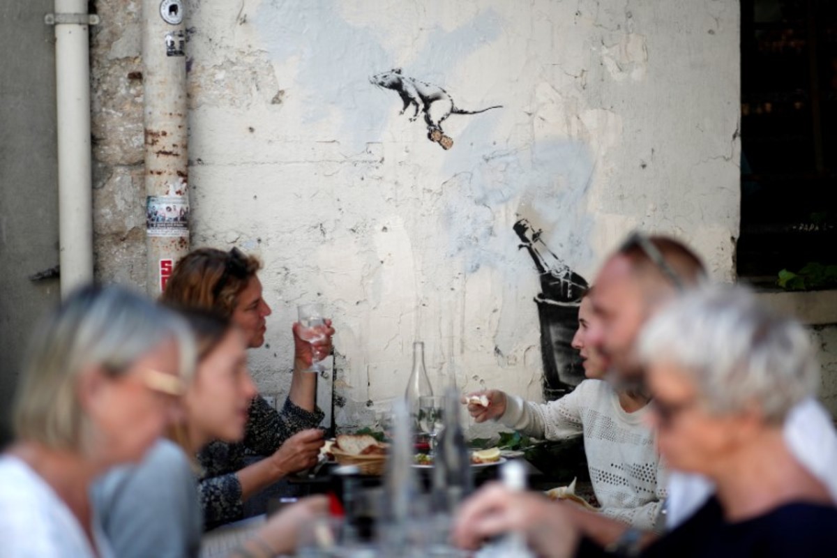 Others depict rats, a common Banksy motif, including one flying through the air on the back of a champagne cork, and a pair walking under a parasol near the Eiffel Tower.