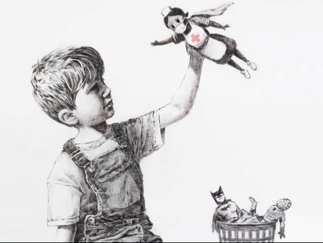 Banksy’s painting of a little boy chucking out his Batman and Spider-Man action figures and choosing one of a caped superhero nurse has sold for a world-record price of £16.7m.