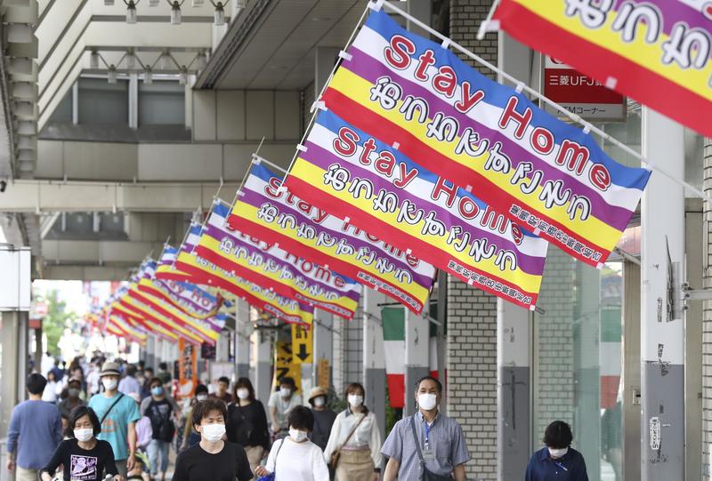 At the Sugamo Station Shopping Street in Toshima Ward, Tokyo, 50 colorful banners with the words "Stay Home Ouchi de Sugosou (Let's stay home)" have appeared in the wake of the spread of the new coronavirus, as a call to people walking through the street that they should go out less.