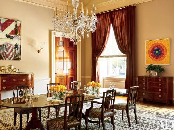 The State Floor’s Old Family Dining Room was opened to the public for the first time in the history of the White House last year, at the request of the First Lady. The artwork has been chosen from the White House permanent collection and features abstract works by American artists. On the left sits a piece by Robert Rauschenberg, while on the right is a piece by Alma Thomas, the first African American woman artist represented in the White House.