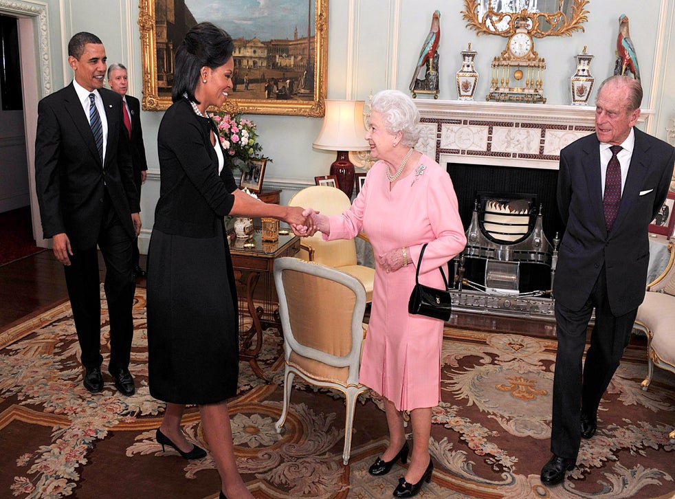 In 2009, the then First Lady was photographed touching the monarch’s shoulder during a visit for a G20 summit at Buckingham Palace.