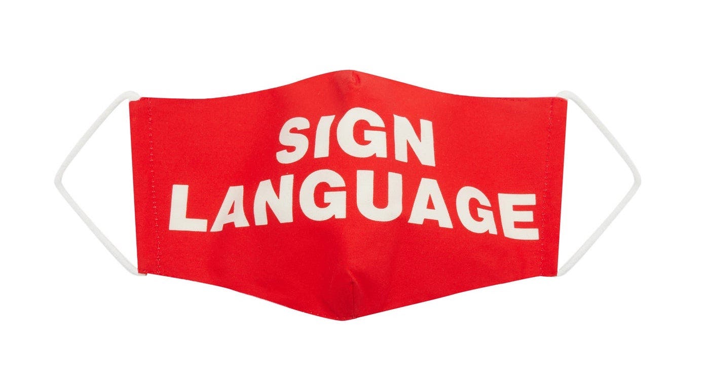 Kruger's mask reads "Sign Language" atop her signature shade of red (you know, the one adopted by Supreme along with the Futura font). It's a reference to her 1985 work Untitled (We Will No Longer Be Seen and Not Heard), which used non-literal sign language to criticize the power of mass media, as well as stereotypes. Here, the phrase "Sign Language" is meant to reflect "the urgency of this critical moment and displays concerns about safety, danger and empathy," according to a press release.