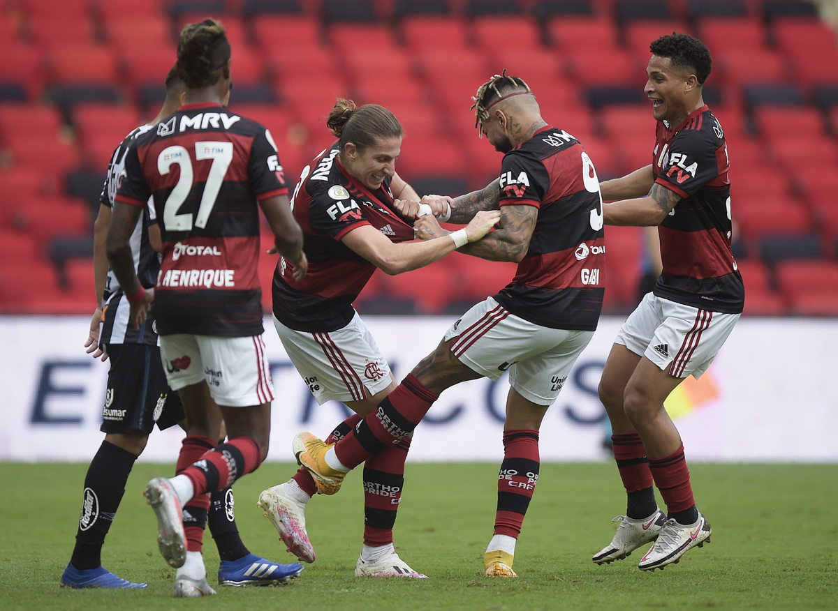 Soccer Football - Brasileiro Championship - Flamengo v Santos - Estadio Maracana, Rio de Janeiro, Brazil - December 13, 2020 Flamengo's Filipe Luis celebrates scoring their third goal with teammates REUTERS/Alexandre Loureiro