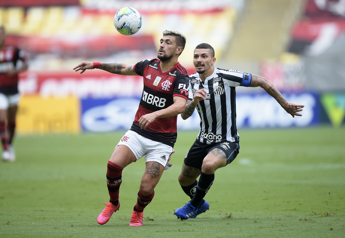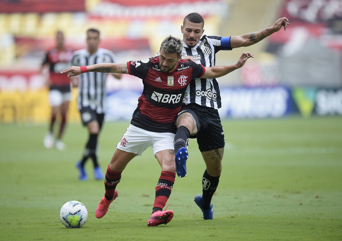 Soccer Football - Brasileiro Championship - Flamengo v Santos - Estadio Maracana, Rio de Janeiro, Brazil - December 13, 2020 Santos' Alison in action with Flamengo's Giorgian de Arrascaeta REUTERS/Alexandre LoureiroSoccer Football - Brasileiro Championship - Flamengo v Santos - Estadio Maracana, Rio de Janeiro, Brazil - December 13, 2020 Santos' Alison in action with Flamengo's Giorgian de Arrascaeta REUTERS/Alexandre Loureiro