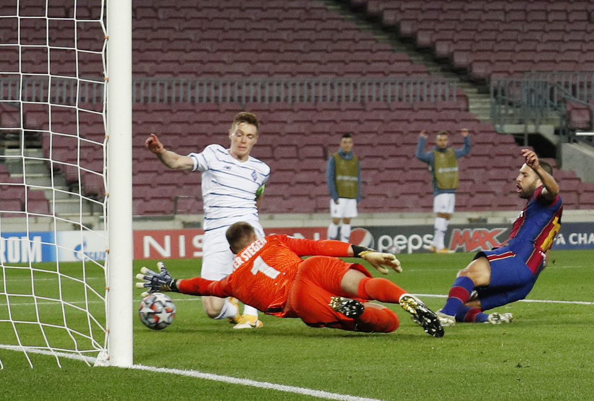 Dynamo should have levelled before halftime when Vitaliy Buyalskyi powered a header at goal but was denied by the strong hand of Ter Stegen, who was making his first appearance of the season after recovering from knee surgery.