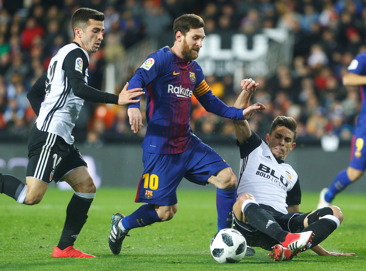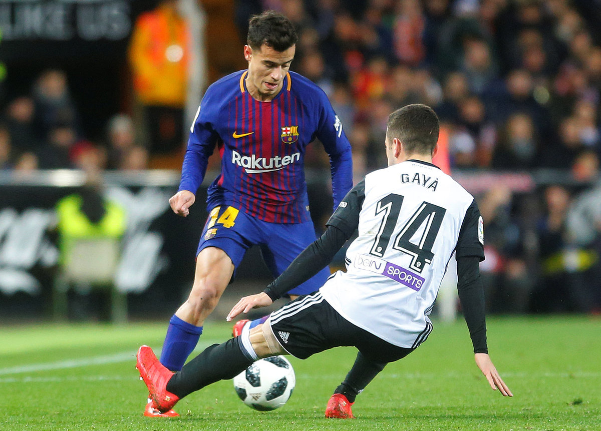 Soccer Football - Spanish King's Cup Semi Final Second Leg - Valencia vs FC Barcelona - Mestalla, Valencia, Spain - February 8, 2018 Barcelona’s Jordi Alba reacts REUTERS/Heino KalisSoccer Football - Spanish King's Cup Semi Final Second Leg - Valencia vs FC Barcelona - Mestalla, Valencia, Spain - February 8, 2018 Barcelona’s Philippe Coutinho celebrates scoring their first goal with Andres Iniesta REUTERS/Heino KalisSoccer Football - Spanish King's Cup Semi Final Second Leg - Valencia vs FC Barcelona - Mestalla, Valencia, Spain - February 8, 2018 Barcelona’s Philippe Coutinho in action with Valencia's Jose Luis Gaya REUTERS/Heino KalisSoccer Football - Spanish King's Cup Semi Final Second Leg - Valencia vs FC Barcelona - Mestalla, Valencia, Spain - February 8, 2018 Barcelona’s Lionel Messi in action with Valencia's Jose Luis Gaya and Gabriel Paulista REUTERS/Heino KalisSoccer Football - Spanish King's Cup Semi Final Second Leg - Valencia vs FC Barcelona - Mestalla, Valencia, Spain - February 8, 2018 Barcelona’s Ivan Rakitic celebrates scoring their second goal with Luis Suarez, Lionel Messi and Paulinho REUTERS/Heino KalisSoccer Football - Spanish King's Cup Semi Final Second Leg - Valencia vs FC Barcelona - Mestalla, Valencia, Spain - February 8, 2018 Barcelona’s Lionel Messi in action REUTERS/Heino Kalis