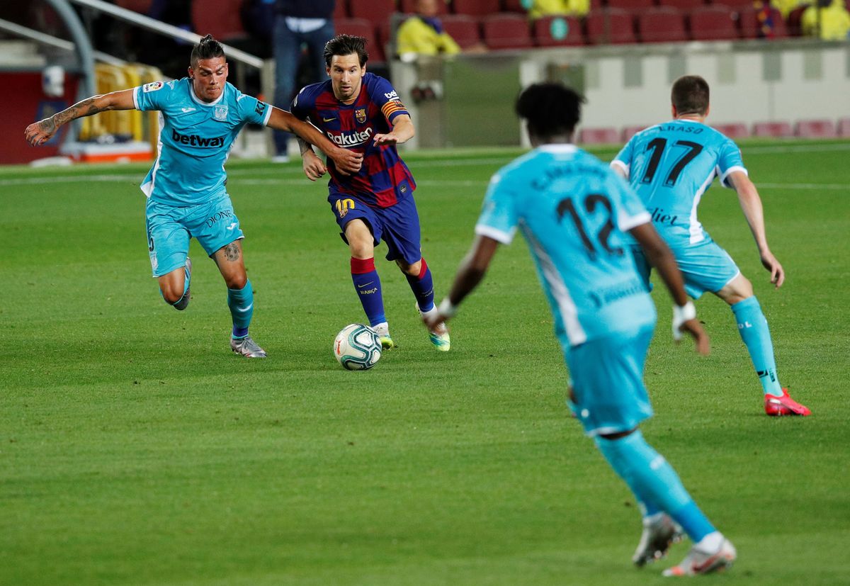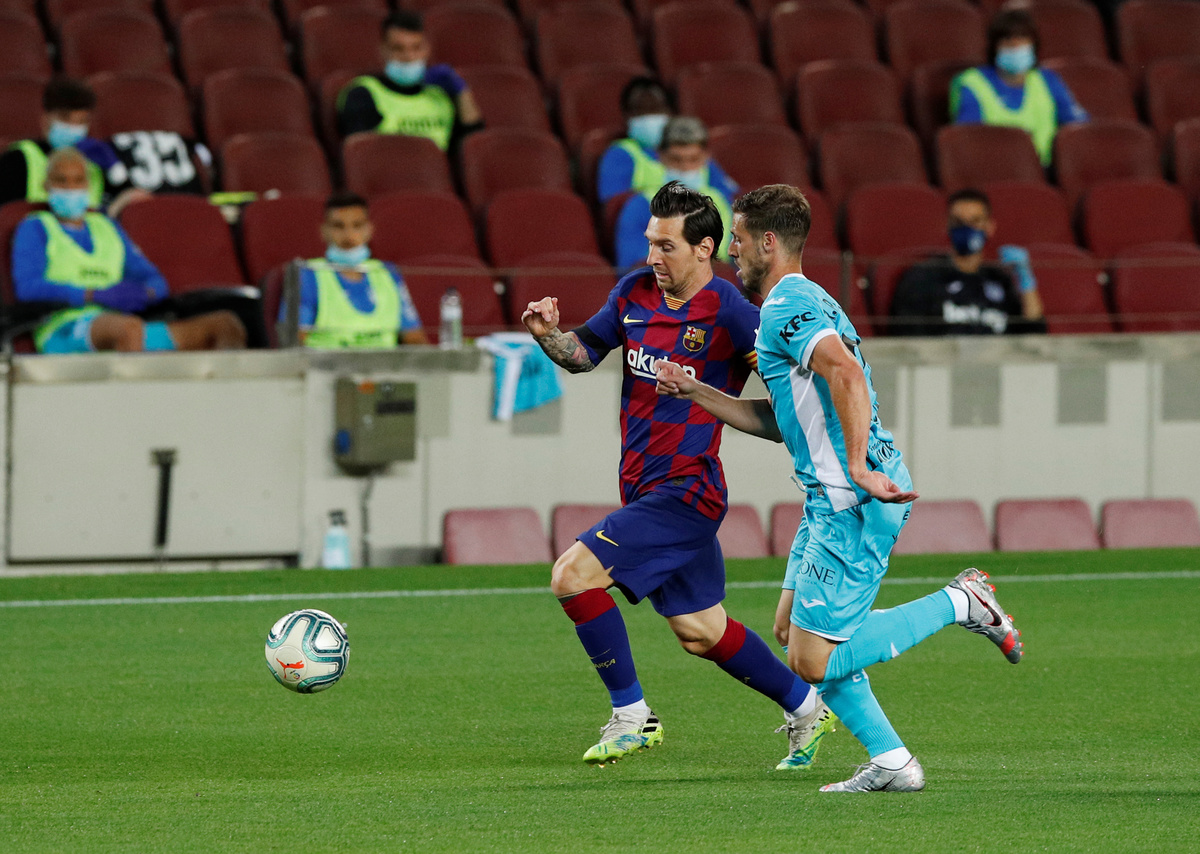 Soccer Football - La Liga Santander - FC Barcelona v Leganes - Camp Nou, Barcelona, Spain - June 16, 2020 Barcelona's Lionel Messi in action with Leganes' Ruben Perez, as play resumes behind closed doors following the outbreak of the coronavirus disease (COVID-19) REUTERS/Albert Gea