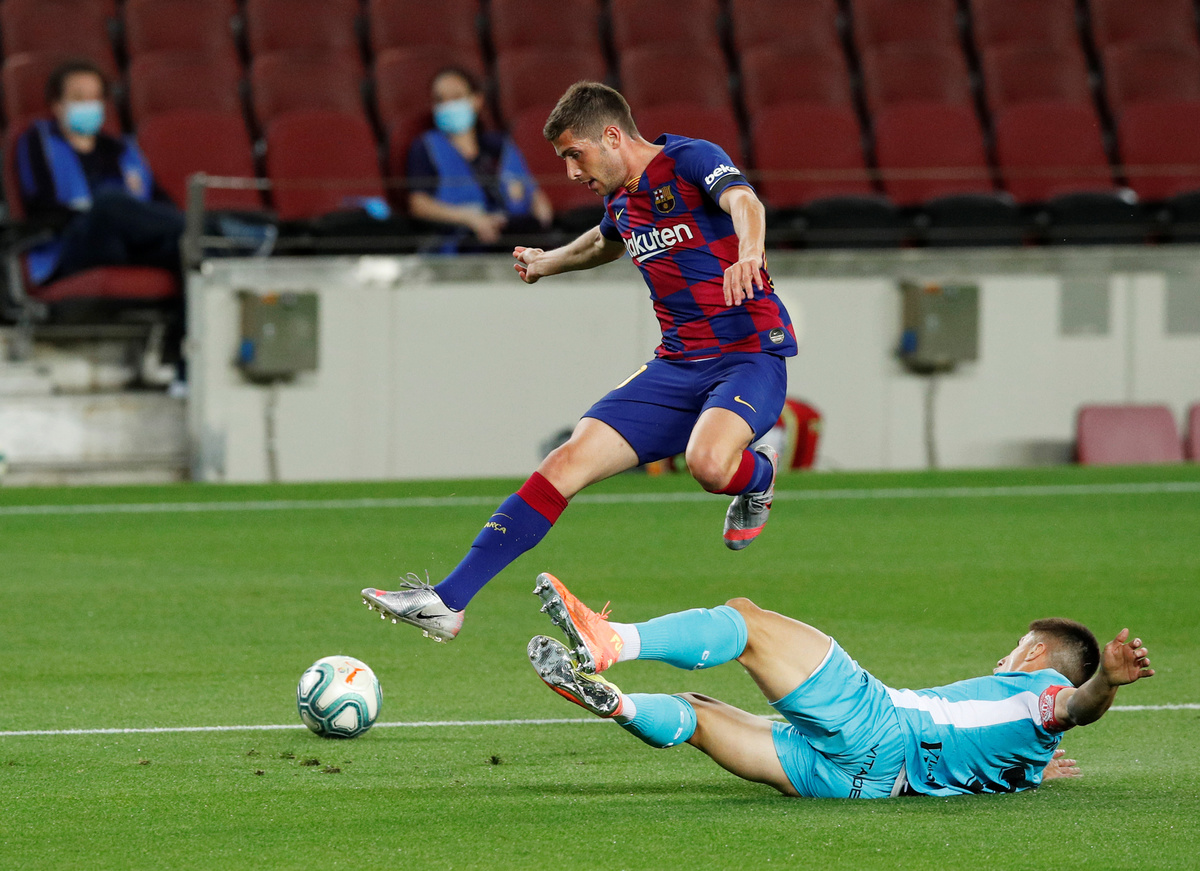 Soccer Football - La Liga Santander - FC Barcelona v Leganes - Camp Nou, Barcelona, Spain - June 16, 2020 Barcelona's Sergi Roberto in action with Leganes' Unai Bustinza, as play resumes behind closed doors following the outbreak of the coronavirus disease (COVID-19) REUTERS/Albert Gea
