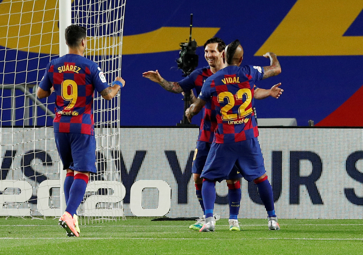 Soccer Football - La Liga Santander - FC Barcelona v Leganes - Camp Nou, Barcelona, Spain - June 16, 2020 Barcelona's Marc-Andre ter Stegen in action, as play resumes behind closed doors following the outbreak of the coronavirus disease (COVID-19) REUTERS/Albert GeaSoccer Football - La Liga Santander - FC Barcelona v Leganes - Camp Nou, Barcelona, Spain - June 16, 2020 Leganes' Aitor Ruibal in action with Barcelona's Arthur, as play resumes behind closed doors following the outbreak of the coronavirus disease (COVID-19) REUTERS/Albert GeaSoccer Football - La Liga Santander - FC Barcelona v Leganes - Camp Nou, Barcelona, Spain - June 16, 2020 Barcelona's Lionel Messi in action with Leganes' Ruben Perez, as play resumes behind closed doors following the outbreak of the coronavirus disease (COVID-19) REUTERS/Albert GeaSoccer Football - La Liga Santander - FC Barcelona v Leganes - Camp Nou, Barcelona, Spain - June 16, 2020 Barcelona's Arthur in action with Leganes' Chidozie Awaziem, as play resumes behind closed doors following the outbreak of the coronavirus disease (COVID-19) REUTERS/Albert GeaSoccer Football - La Liga Santander - FC Barcelona v Leganes - Camp Nou, Barcelona, Spain - June 16, 2020 Barcelona's Lionel Messi in action with Leganes' Jonathan Silva, as play resumes behind closed doors following the outbreak of the coronavirus disease (COVID-19) REUTERS/Albert GeaSoccer Football - La Liga Santander - FC Barcelona v Leganes - Camp Nou, Barcelona, Spain - June 16, 2020 Barcelona's Lionel Messi celebrates scoring their second goal with teammates, as play resumes behind closed doors following the outbreak of the coronavirus disease (COVID-19) REUTERS/Albert GeaSoccer Football - La Liga Santander - FC Barcelona v Leganes - Camp Nou, Barcelona, Spain - June 16, 2020 Barcelona coach Quique Setien talks to his players during a drinks break, as play resumes behind closed doors following the outbreak of the coronavirus disease (COVID-19) REUTERS/Albert GeaSoccer Football - La Liga Santander - FC Barcelona v Leganes - Camp Nou, Barcelona, Spain - June 16, 2020 Barcelona's Antoine Griezmann celebrates a goal with Lionel Messi before it is disallowed by VAR, as play resumes behind closed doors following the outbreak of the coronavirus disease (COVID-19) REUTERS/Albert GeaSoccer Football - La Liga Santander - FC Barcelona v Leganes - Camp Nou, Barcelona, Spain - June 16, 2020 Barcelona's Anssumane Fati celebrates scoring their first goal with teammates, as play resumes behind closed doors following the outbreak of the coronavirus disease (COVID-19) REUTERS/Albert GeaSoccer Football - La Liga Santander - FC Barcelona v Leganes - Camp Nou, Barcelona, Spain - June 16, 2020 Barcelona president Josep Maria Bartomeu wears a mask as he watches from the stands, as play resumes behind closed doors following the outbreak of the coronavirus disease (COVID-19) REUTERS/Albert Gea