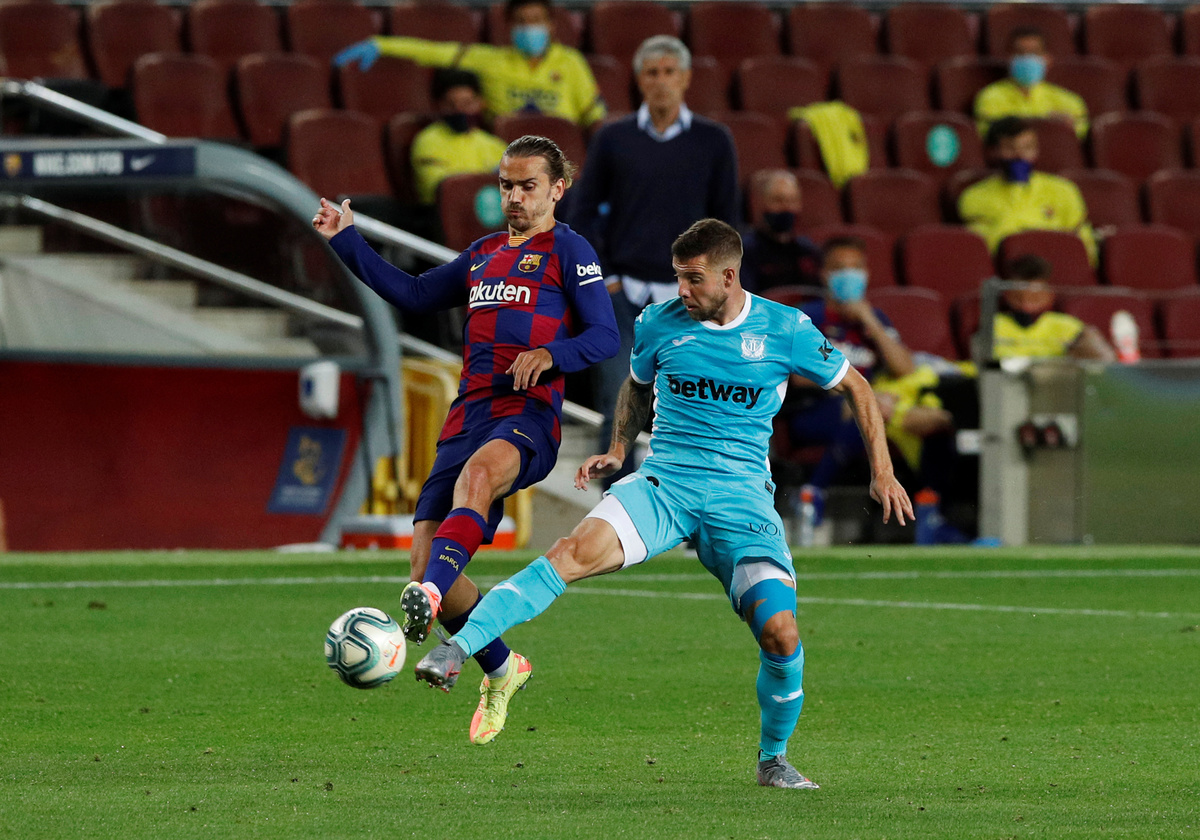 Soccer Football - La Liga Santander - FC Barcelona v Leganes - Camp Nou, Barcelona, Spain - June 16, 2020 Barcelona's Antoine Griezmann in action with Leganes' Guido Carrillo, as play resumes behind closed doors following the outbreak of the coronavirus disease (COVID-19) REUTERS/Albert Gea
