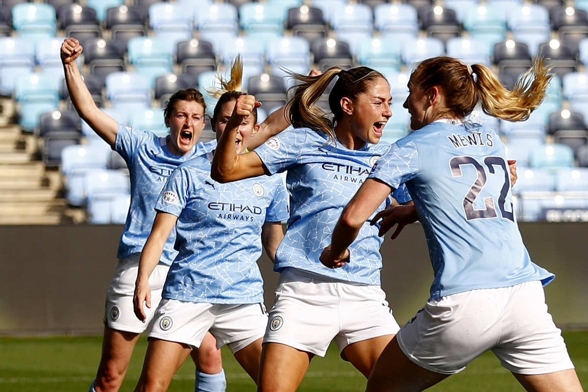Soccer Football - Women's Champions League - Quarter Final - Second Leg - Manchester City v FC Barcelona - Manchester City Academy Stadium, Manchester, Britain - March 31, 2021 Manchester City's Janine Beckie celebrates scoring their first goal with teammates Action Images via Reuters/Jason Cairnduff